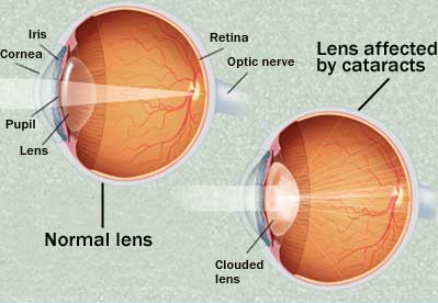 A cataract is a gradual clouding of the eye's natural crystalline lens. The lens assists with focusing light rays onto the retina, which communicates images to the brain. After the cataract starts to cloud the lens, the vision changes. In the beginning, these changes can be corrected with a change in glasses; when a change in glasses no longer helps, then removal of the cataract can improve the vision. Things that can worsen cataracts include cigarette smoking, diabetes, and prolonged exposure to sunlight.
