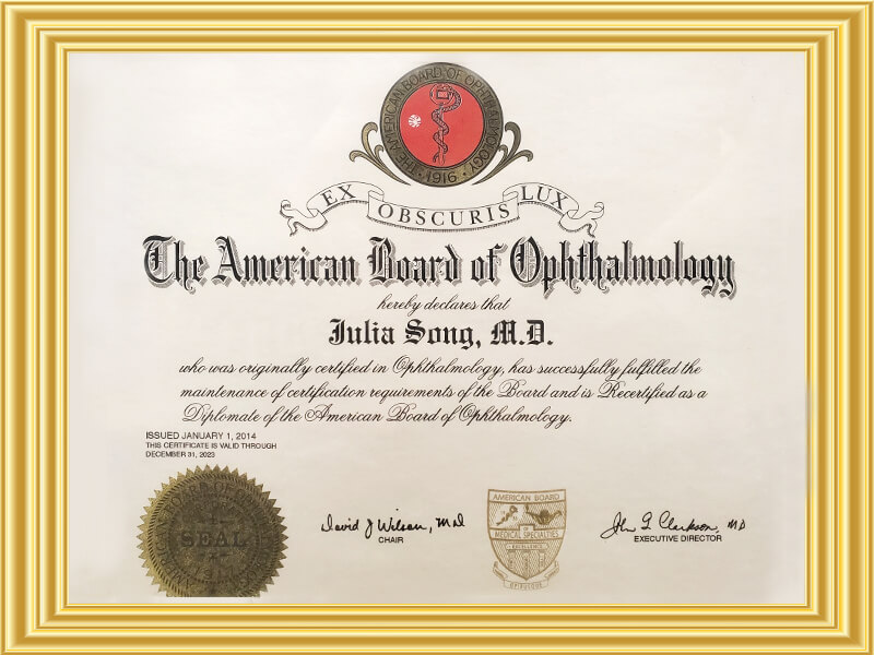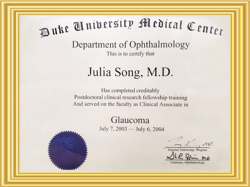 Dr. Song completed her postgraduate training in ophthalmology at the University of Texas Southwestern in Dallas, TX. She then completed a two year glaucoma fellowship at Duke University in Durham, NC. during which she conducted an extensive amount of research on new treatments for glaucoma. She is the recipient of the Pfizer Ophthalmics Third Annual Glaucoma Fellowship as well as the Fight for Sight ARVO/Alcon Laboratories Grant. She was in private practice in San Diego, CA. She then became Assistant Professor in Ophthalmology at Loma Linda University where she was also Director of the Glaucoma Service. She is Assistant Clinical Professor of Ophthalmology at the USC/Keck School of Medicine.