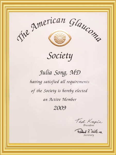 She is a fellow of the American Board of Ophthalmology and a member of the American Glaucoma Society. She is also an active member of the American Society of Cataract and Refractive Surgery.